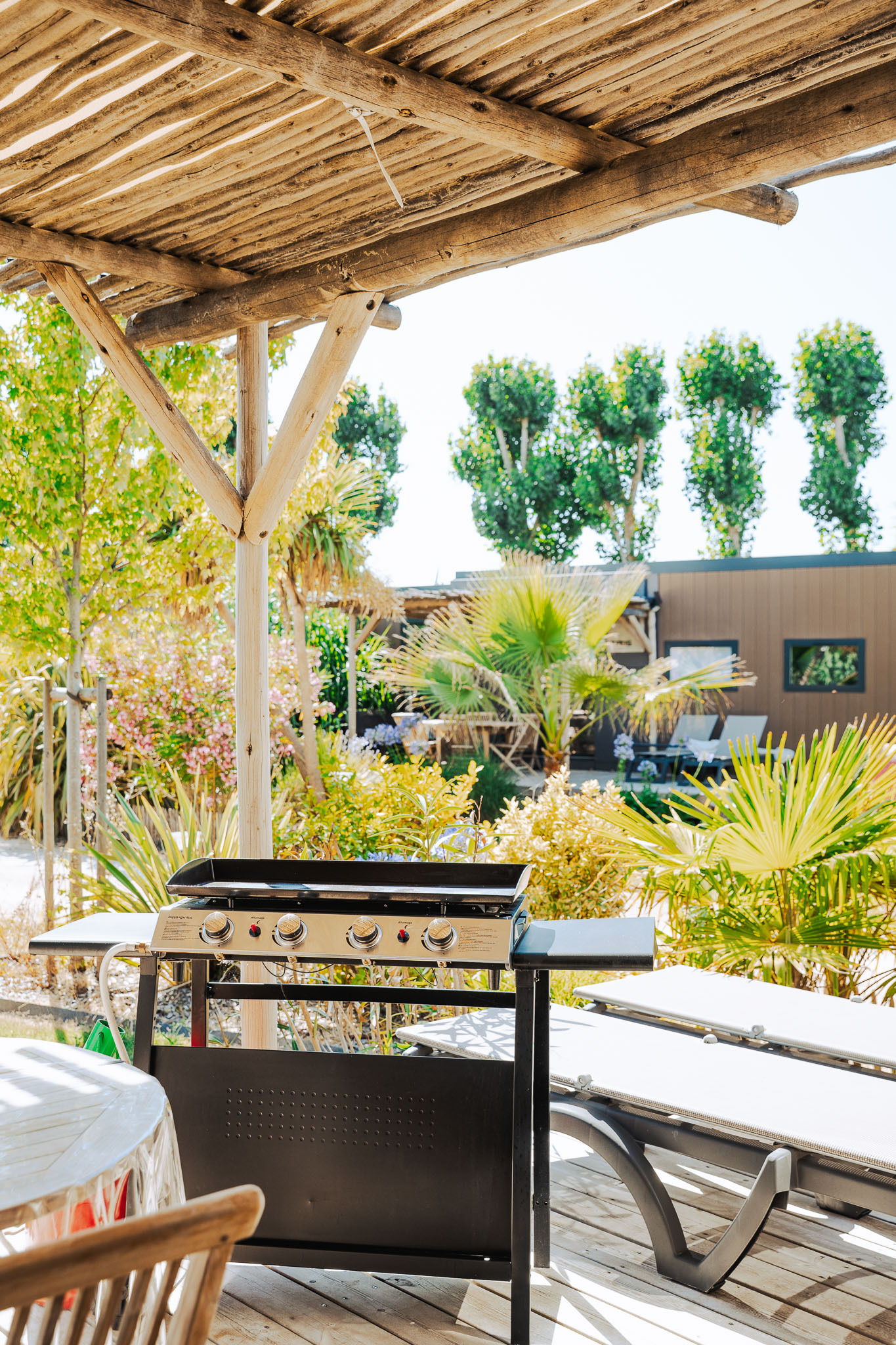 - Houten terras met schaduwdoek